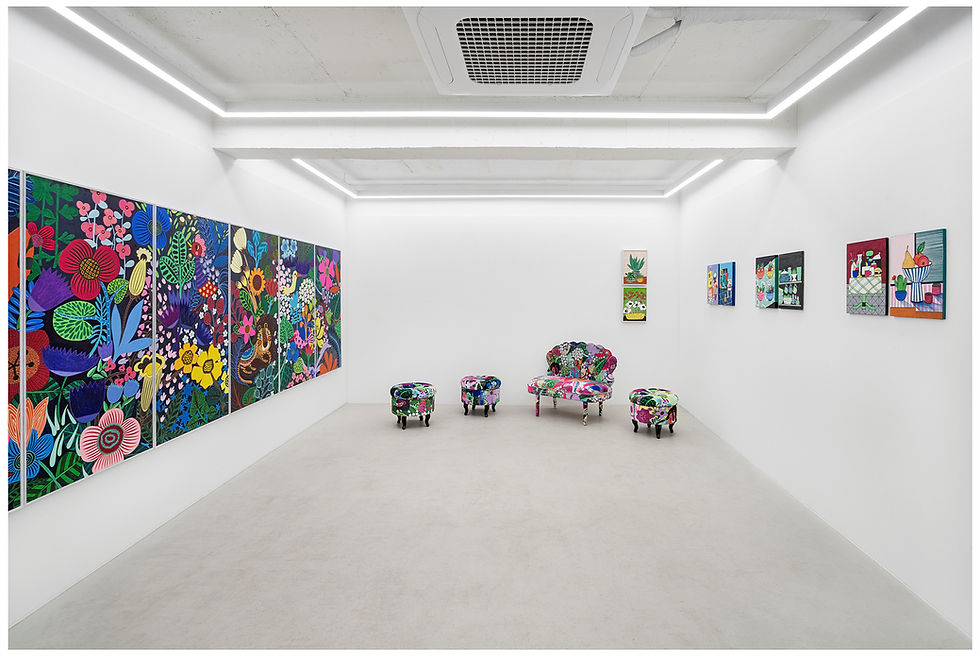 H-flux Galley is pleased to present , a solo exhibition by Taeyeol Kim, from April 18th to May 8th. A teacup perched precariously at the edge of a dining table, a teapot, layers of dishes and pots piled in the sink, or a vegetable basket placed in a corner of the kitchen. These are objects so familiar they barely register in our daily existence. The work of Taeyeol Kim makes these trivialities the center of attention. On her canvas, the mundane is no longer a backdrop; it becomes the subject. How and when did such ordinary, humble objects become art? In Western tradition, fine art was considered a realm of the "sublime," elevated above daily life. Since the establishment of modern aesthetics in the 18th century, art positioned itself as a noble, spiritual product, distancing itself from everyday realities. Particularly under the formalist lens of Modernism, the complexities of ordinary life were often considered ‘impure.’ Pop Art emerged as a reaction to this elitistism, bringing icons of mass culture like soup cans and Coca-Cola to the forefront. It was an attempt to return the quotidian to the center of art, creating works that reflect life rather than "art for art’s sake." In a similar vein, Minhwa (Korean folk painting) from the Joseon Dynasty, which is currently seeing a resurgence in Korea, had already integrated the everyday into artistic expression long before the advent of Western Pop Art. While borrowing the conceptual landscapes of the literati or the rigid styles of court paintings, Minhwa broke existing artistic frameworks through playful subversion and variation. While Pop Art used images of a consumer society, Minhwa differed by embedding the specific desires and hopes of common people within ordinary objects. However, both intersect in their "kitsch" sensibility: Minhwa dismantled the threshold of high art—dominated by the restrained, monochromatic tones of Neo-Confucian authority—by embracing vibrant primary colors and honestly affirming the desires of the masses. In this exhibition, Kim presents works that translate the everyday sensibilities of Minhwa into a contemporary language. Having mastered the traditional iconography of Minhwa over several decades, the artist now shifts her focus to subjects seen through a female gaze. By using personal possessions that provide an insight into her life—rather than adhering to standardized traditional motifs—Kim builds upon the profound expertise she has gained through years of study. This show is her attempt to expand the horizons of Minhwa, bridging tradition and her own reality. For instance, the kitchen cabinets in her work evoke the structure of traditional ‘Chaekgado’ (scholar’s paraphernalia), yet they are reconstructed with volume and perspective stripped away. Sausages, cups, apples, and cheese are densely arranged, transforming the canvas into a richly decorated space. From pots stacked in the sink to salad bowls, vases, and even cleaning utensils, these utterly mundane objects fill the canvas with brilliant patterns and colors. The combination of Minhwa’s multi-focal perspective (revealing top and side views simultaneously) and inverse perspective (adjusting size based on psychological importance) liberates the viewer from convention, offering a fresh, playful look at ordinary life. This approach recalls the paintings of Henri Matisse, who covered interior spaces with colors and patterns, blurring the distinction between subject and background. Just as Matisse expressed vitality discovered in Mediterranean light and exotic objects, Kim reconstructs her scenes with vibrant color and ever-changing perspectives. While traditional Minhwa dealt with stylized motifs (including peonies, for instance, or the ten traditional symbols of longevity), Kim focuses on small objects that have never been associated with deeper meaning. She focuses instead on items like cutlery, crockery, and cleaning utensils—often overlooked due to their ubiquity—and transforms them into a delightful kind of artistic language, far removed from a realistic depiction. This can be seen as a "Pop" experiment that inherits the joyful spirit of traditional Minhwa while elevating marginalized or insignificant subjects to the center of modern art. Behind this transformation of the banal lies a narrative of seventy years of female existence. Decades of endurance and devotion to supporting a husband and raising children within a patriarchal society are concentrated in these works. Just as sewing was a quiet form of escapism for Joseon-era women—helping them tolerate a grueling life and manage their emotions stitch by stitch—Minhwa became the artist's means to break free from the constraints of reality and find herself. Every hour spent holding a brush became a meditative period in which distractions vanished, and art demanded consistency and discipline. Thus, her work is not a reproduction of reality; it is personal freedom, redeeming herself from the restrictions of her former life and awakening an ego long suppressed.